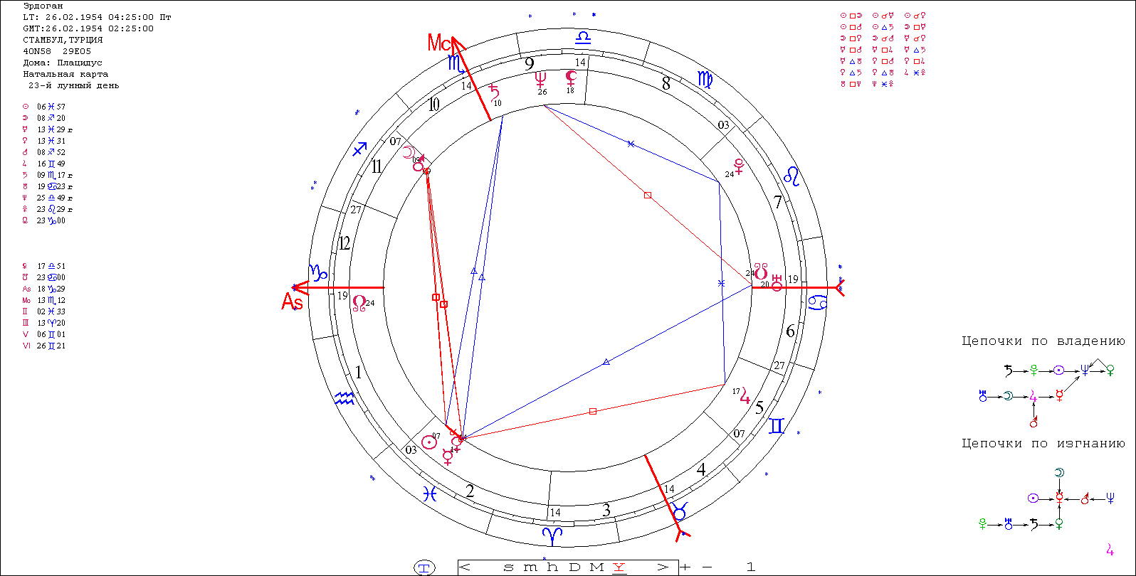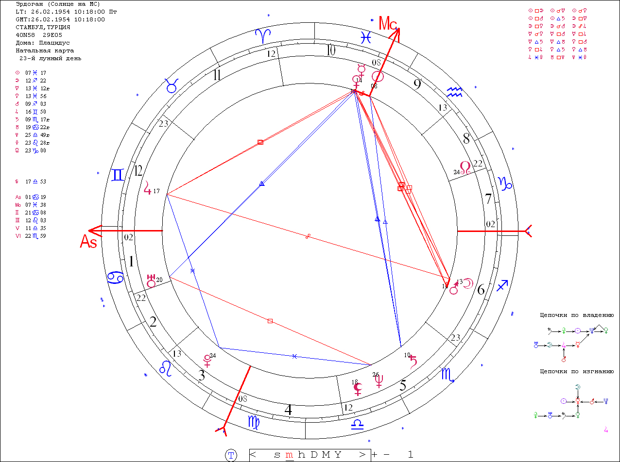 Турецкая карта очень яркая и астрологически, по-моему, красива. Сама конфигурация, праща с Ураном на вершине, с водным большим тригоном. Две мощные звезды 1 величины в соединении с двумя высшими планетами, планетами, которые к тому же являются доминантами карты, находятся на АС и на МС.