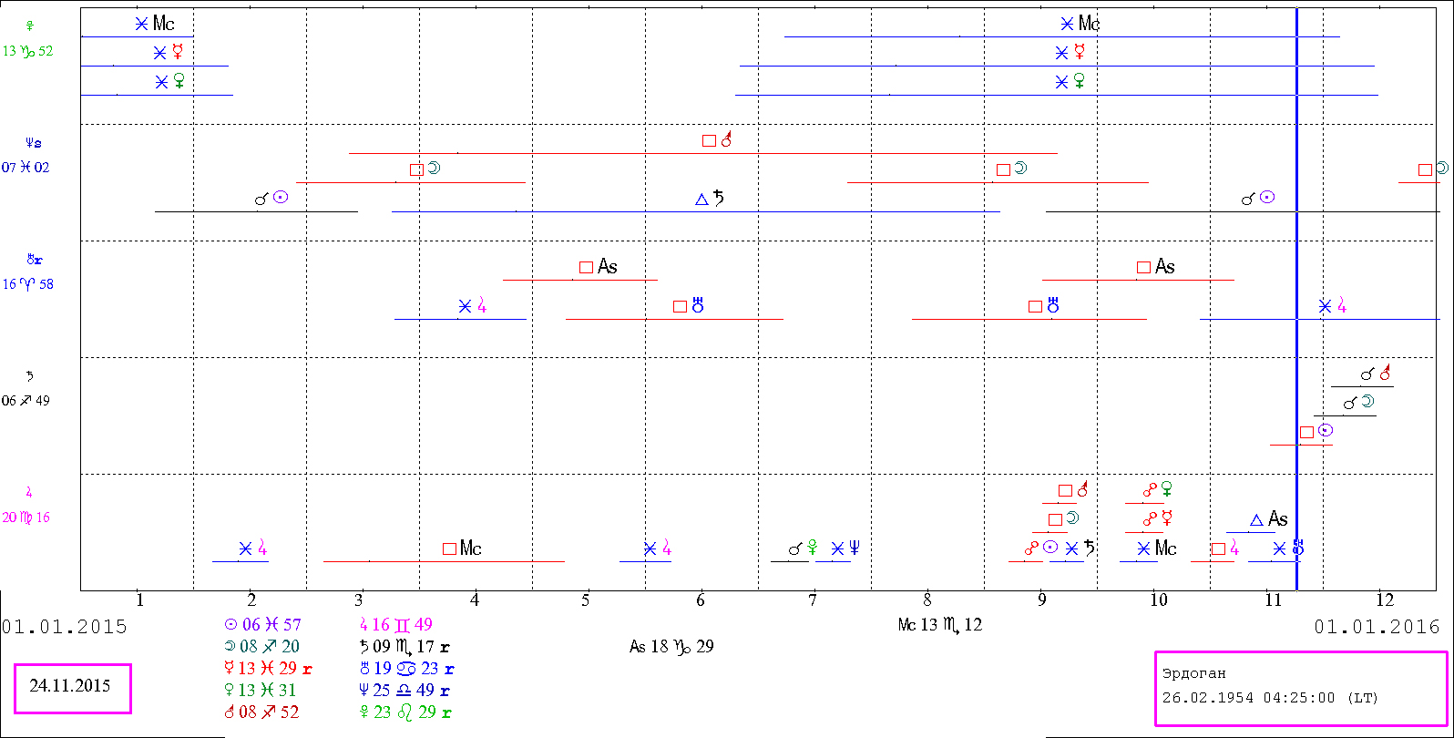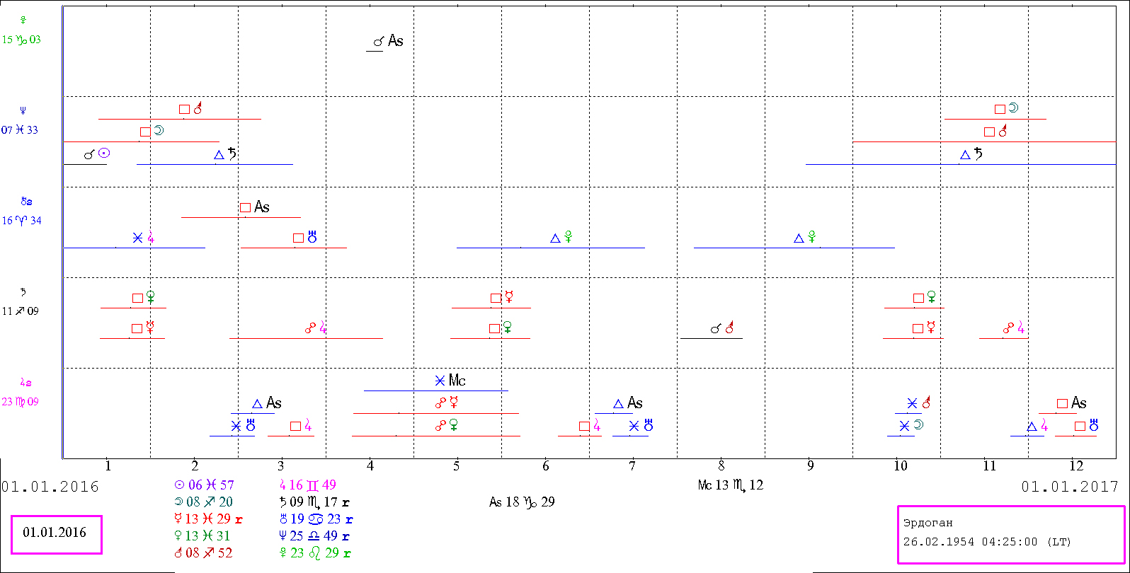 В 2016 году к концу января заканчивается последний 3-ий одноорбисный проход Нептуна по Солнцу. И действие этого аспекта формально может начать ослабевать. Это, пожалуй, самый главный транзит в карте. Ведь Солнце в карте страны (а это ведь карта страны) – это политический курс руководства. И возможно появится более взвешенный и приближенный к реальности и не столь подверженный особым влияниям курс. Есть вероятность, что конфликт, если ситуация не выйдет до этого из-под контроля, начнет смягчаться. Но, при этом, весь год эта карта Турции под очень напряженными и агрессивно непредсказуемыми аспектами с символикой Марс-Антарес, Нептун, Сатурн.