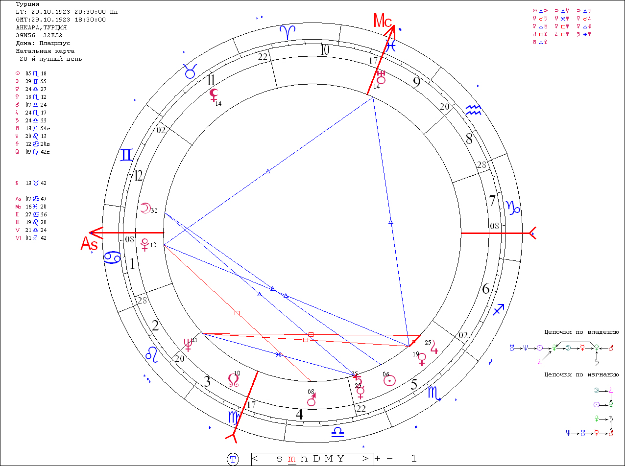 Интересно, что Ататюрк (псевдоним, в переводе означающий «Отец турков») был избран официально президентом новой республики 29.10.1923 через 15 минут после ее провозглашения (если верить Кэмпиону, как источнику). Плутон в этот момент совершенно точно на АС. И его президентство было воистину плутоническим по размаху реформ, колоссальных преобразований, по жестким формам их исполнения. Ататюрк имел диктаторские полномочия и трижды переизбирался в президенты.