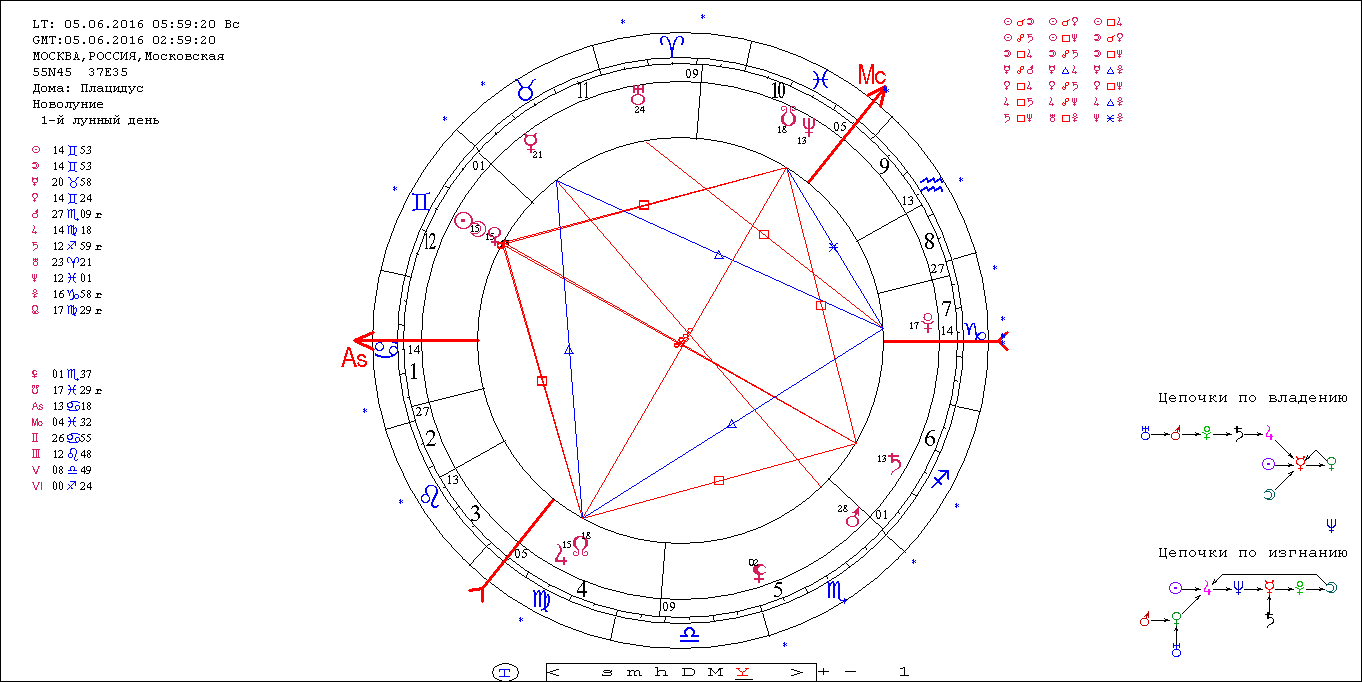 В таких случаясь особо важно, насколько точный этот самый крест, то есть каковы орбисы. В орбисе 3 градуса (то есть достаточно точный этот крест) крест с Солнцем и Венерой, дополняющими до креста тау-квадрат Нептун-Сатурн-Юпитер, держится с 31.05 по 5.06. И 5.06 Луна в момент новолуния приносит ему максимум энергетики, задавая таким вот крестом программу месяца. Крест может говорить о повышенной вероятности материализации в реальных событиях накопившихся проблем. Причем события могут носить кризисный характер.