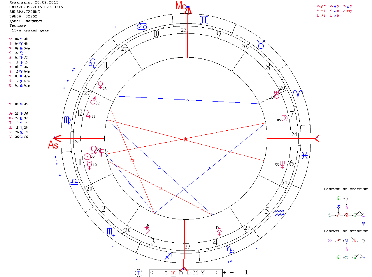 Но особый интерес представляет в данном случае анализ затмений. Лунное затмение 28.09.2015 попадает своей осью на Марс в карте Турции. Это ближайшее перед событиями затмение. Это известный классический негативный фактор – попадание затмения на Марс или Сатурн карты, очень часто это предзнаменование кризисной тяжелой ситуации. Марс – военная символика. И также известно, что включение затмения, то есть событие, очень часто происходит именно Марсом. И Марс, как говорилось, 24.11.2015 был точно на Марсе карты Турции, и при этом в 3 градусах орбиса от точки оси затмения. То есть классический случай включения энергетики затмения.