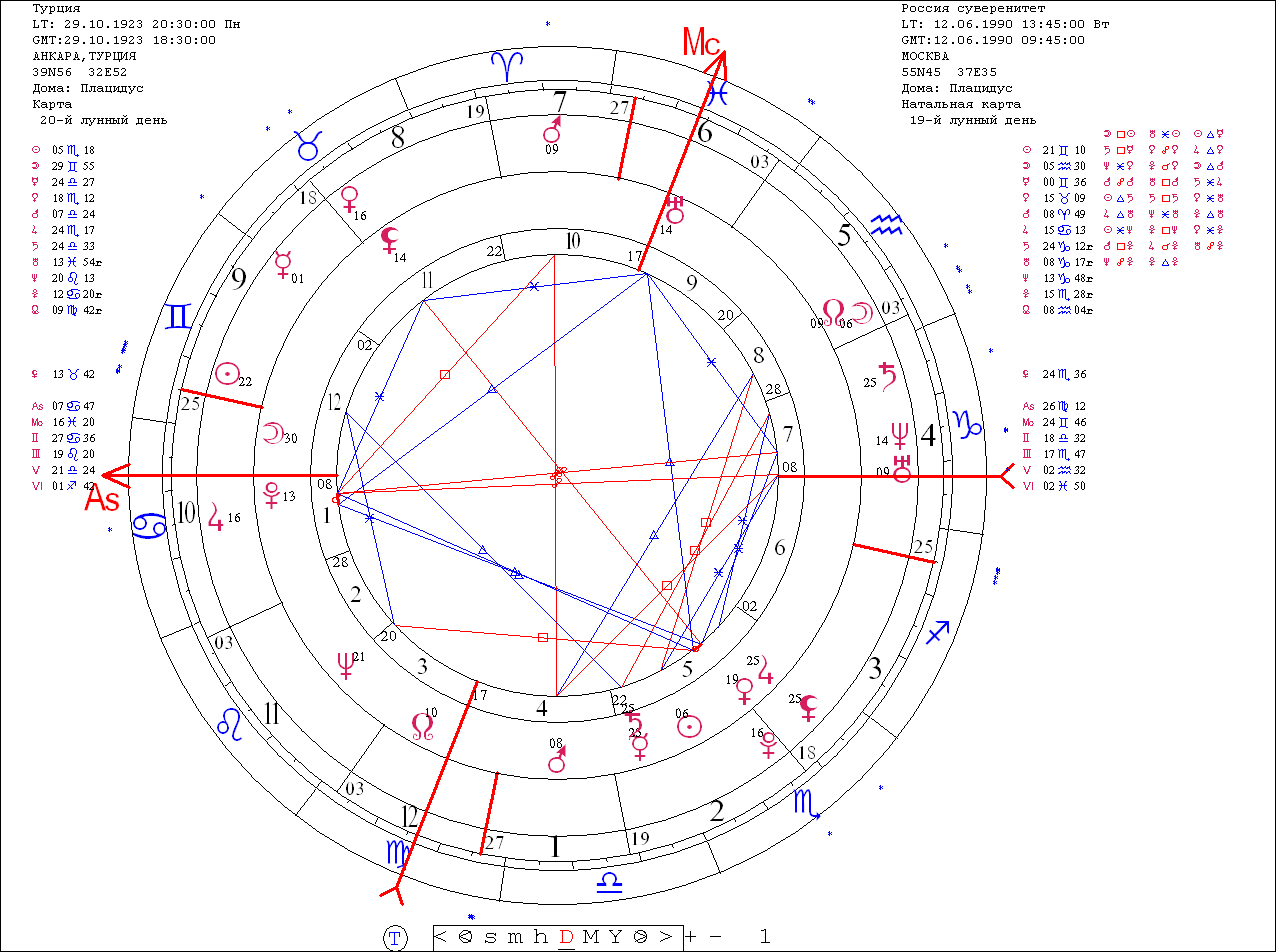 В карте российского суверенитета осенью включаются несколько довольно жестких аспектов в прогрессиях и дирекциях. В частности, прогрессивная Луна с Сатурном соединяется (часто указывает на какие-то серьезные ограничения), Уран дирекционный входит в орбис 1 градус соединения с Луной карты (аспект на два года в орбисе 1 градус), присоединяясь к уже действующему квадрату дирекционного Марса к Луне. В транзитах разнообразные влияния. Кстати, в конце весны и в первой половине лета выражены благоприятные аспекты Юпитера, в частности, умиротворяющий аспект Юпитер трин к Венере карты. Юпитер в августе переходит в первый дом карты и начинает новый 12-тилетний цикл по гороскопу страны. Возможно, появятся какие-то новые идеи и программы, но вот какие? А в октябре Юпитер, проходя по Весам, включает оппозицию Марса национальных карт России и Турции. Но ведь это Юпитер, а не затмение.