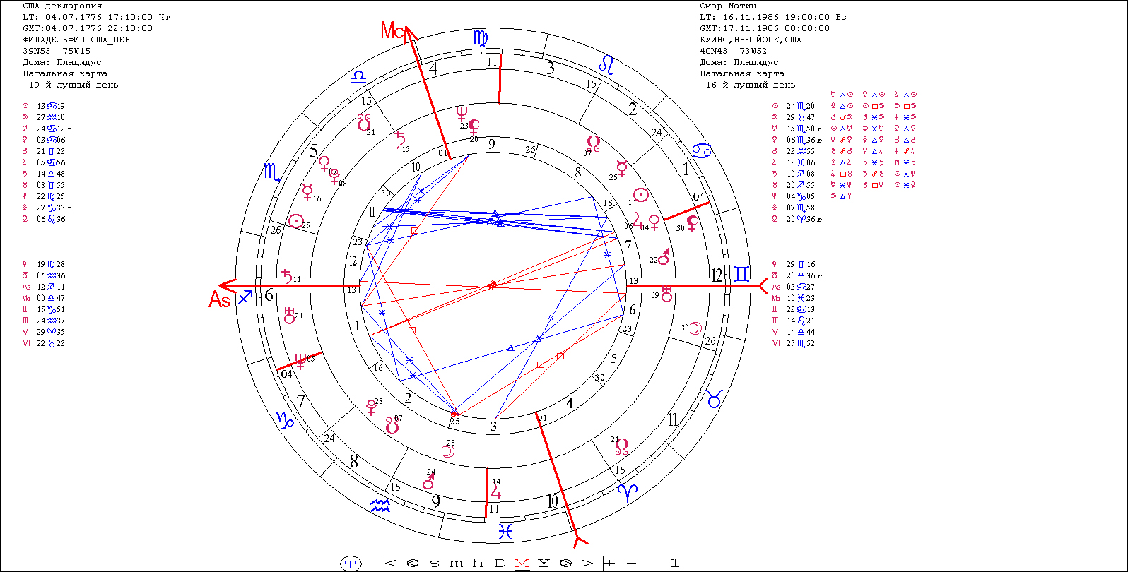 При наложении карты Омара Матина на карту США сразу можно увидеть продолжение, вернее, разворачивание сюжета Сатурн – Антарес – Ас карты США. Дело в том, что Сатурн в карте Матина точно в соединении с Антаресом и в соединении с Ас карты США. То есть этот человек мог каким-то образом становиться воплощением определенной части жесткой, под влиянием Сатурна, символической программы Антарес и символики Сатурна, появляющегося на Ас карты страны. Достигает максимальной силы энергетика этой программы в тот момент, когда транзитный Сатурн проходит по Сатурну в карте Матина, и одновременно по асценденту карты страны и Антаресу.