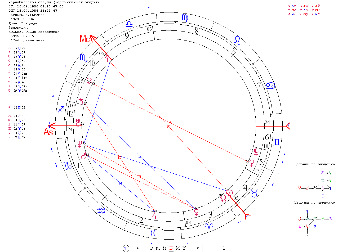 Кстати, если построить эту карту на Москву, то можно видеть астрологическое подтверждение тому, что эта катастрофа оказала серьезнейшее влияние на политическую судьбу страны. Здесь Плутон на МС (говорит о повышенной вероятности очень серьезных событий и перемен во власти и системе управления страны, вплоть до разрушения существующей системы), Уран на Ас, Солнце на Ис. Оппозиция Плутон – Солнце на вертикальной оси карты.
