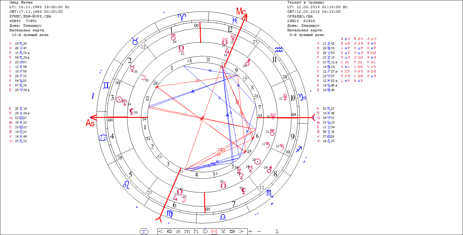 Очень жестко символично вписывается в астрологическую картину трагедии в Орландо карта убийцы, карта Омара Матина. Он родился 16.11.1986 в Куинсе, Нью-Йорк. Время рождения - 19:00 согласно данным www.astro.com и www.astrotheme.com
