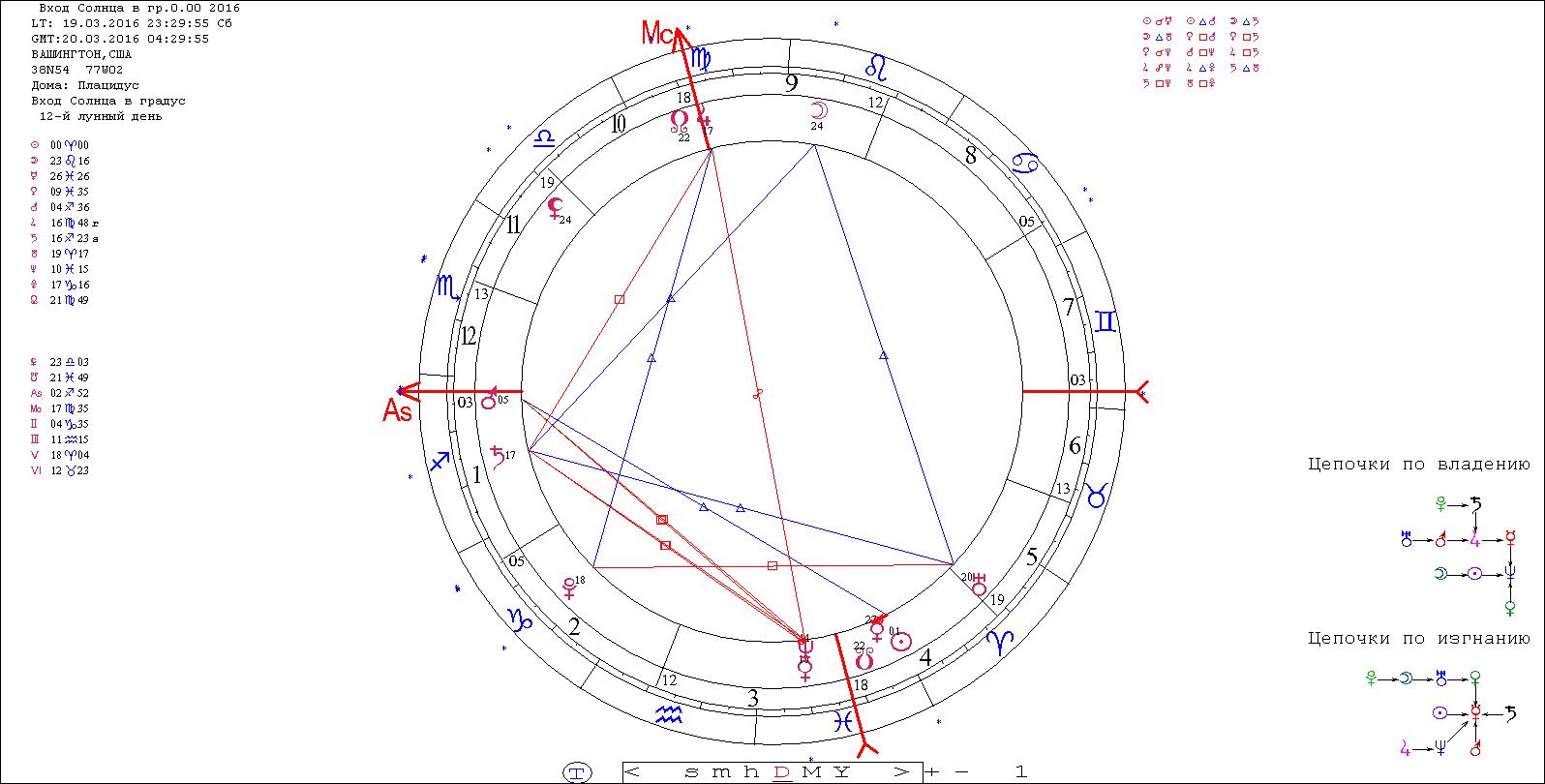 Карта входа Солнца в Овен 2016 года, построенная на столицу США, дает Марс на АС в орбисе менее 2-х градусов. Что может служить указанием на вероятность актов агрессии, конфликтов, жестких кризисных и аварийных ситуаций. Марс символически связан также с огнестрельным оружием, военными и экстремистскими действиями и т. п. И Марс особо характерен для индивидуальных агрессивных действий отдельных лиц.