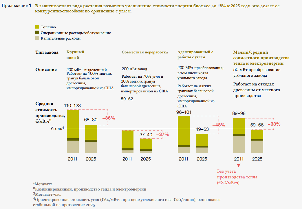 Как же вписать сюда биомассу? Наш анализ показывает, что существует возможность сократить стоимость биоэнергии почти вдвое к 2025 году. Это потребует значительных усилий, но не новых технологий. Например, КПД котла при производстве биоэнергии часто не превышает 30%. Некоторые улучшения, такие как увеличение параметров пара [3], позволят сократить объем необходимого сырья и снизить затраты. Стандартизация оборудования и конструкций для производства биоэнергии также может подтолкнуть цены вниз. И наконец, затраты могут быть снижены путем применения бережливого производства, чтобы исключить ненужные затраты в цепи поставок. Как показано в приложении 1, подобные меры могут сократить стоимость биоэнергии до конкурентоспособной по сравнению с углем.