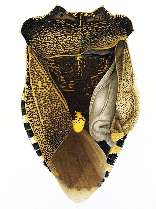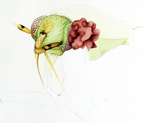 Цюрихский художник и научный иллюстратор Гессе-Онеггер всматривается в микроскопы и рисует изуродованных насекомых уже несколько десятилетий. Её интересуют представители отряда полужесткокрылых — клопы-солдатики, тли, цикады и др. Если вам попадались старые учебники с их яркими картинками, вы испытаете чувство ностальгии.