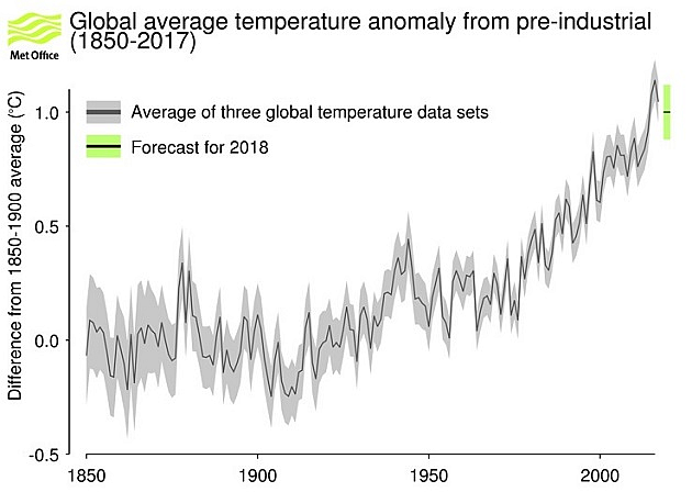 Рисунок 11. Изменения глобальной температуры воздуха и её прогноз на 2018 по версии Метеорологического офиса Великобритании (https://www.metoffice.gov.uk/news/releases/2017/2018-global-temperature-forecast).