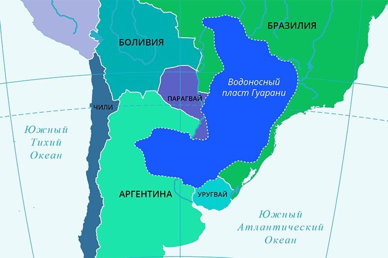 Водоносный горизонт Гуарани относится к классу трансграничных и расположен на территории четырёх южноамериканских государств — Бразилии, Аргентины, Парагвая и Уругвая.