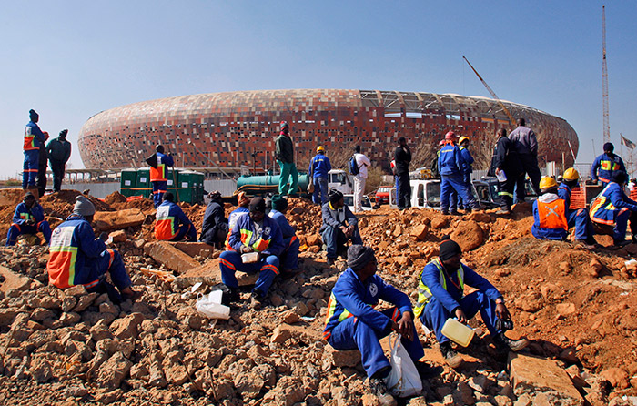 Сколько человек работают на строительстве стадионов и инфраструктуры, когда страна готовится принять крупное спортивное мероприятие вроде чемпионата мира по футболу? В июле 2009 года президент ЮАР Джейкоб Зума мог дать более-менее точный ответ на этот вопрос: более 70 000 строителей, занятых на спортивных объектах, забастовали. Многотысячная толпа вооруженных палками людей вышла на улицы Йоханнесбурга, рабочие требовали увеличить им зарплату на 13%, в противном случае угрожали не расходиться до 2011 года, то есть сорвать чемпионат. К переговорам с профсоюзами подключились чиновники ФИФА и оргкомитет. Через неделю рабочие вернулись на свои места, добившись повышения зарплаты на 12%.