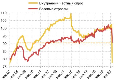 Предварительные данные Росстата говорят об исключительно резком падении уровня экономической активности в апреле на фоне введения жестких ограничительных мер, направленных против распространения коронавирусной инфекции. Индекс базовых видов экономической деятельности упал в апреле 2020 г. на 8,7% к марту и на 10,1% к апрелю прошлого года. Две трети падения пришлось на беспрецедентное падение потребления. Менее сильное снижение наблюдалось в обрабатывающей промышленности, а другие базовые сектора "не заметили" кризиса. После ажиотажного спроса в 1 квартале население вынужденно перешло к сберегательной модели, сохранение которой может затруднить восстановление экономической активности. "В мае-июне сдерживающее воздействие на экономическую активность будет оказывать необходимость снижения нефтедобычи на 23% к уровням апреля", - отмечается в прогнозе.