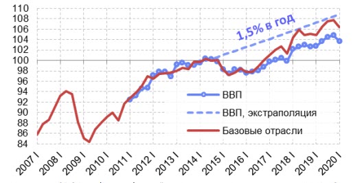 Динамика ВВП и индекса базовых видов экономической деятельности в реальном выражении (100 = 2014 г., сезонность устранена)