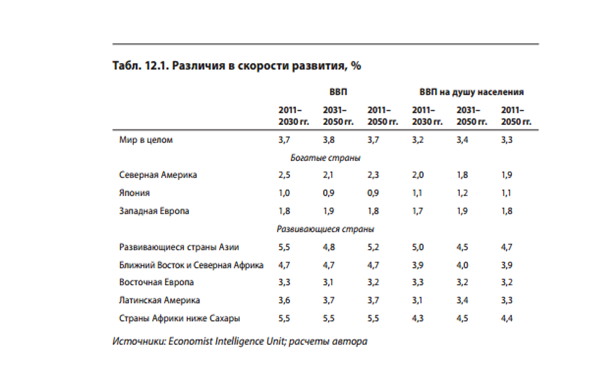 Прогнозы по ВВП в этой главе основаны на данных Economist Intelligence Unit на период 2010–2030 гг., которые автор рассчитал на период до 2050 г. Согласно этим прогнозам, среднегодовой темп роста реального мирового ВВП, измеренного с учетом паритета покупательной способности на 2010 г. (ППП), составит 3,7%, а рост реального ВВП на душу населения за тот же период — 3,3%. Прогнозируемый среднегодовой рост реального ВВП ожидается ниже, чем в 1950–1970 гг. (4,9%) или за 8-летний период, предшествовавший кризису 2008 г. (4,2%). Однако вследствие низкого прироста населения прирост на душу населения в 2010–2050 гг. произойдет немного быстрее, чем в 1950–1970-х и 2000–2008 гг. Самым быстроразвивающимся регионом в следующие четыре десятилетия (с позиции ВВП на душу населения) станет развивающаяся Азия (4,7%), за которой идут страны Черной Африки, (4,4%), Ближнего Востока и Северной Африки (3,9%). Латинская Америка (3,3%) и Восточная Европа (3,2%) немного отстанут от других развивающихся регионов. Рост в нынешних богатых регионах значительно замедлится.