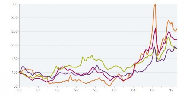 Сводный график индексов товарно-сырьевых цен, 1980–2012 гг.