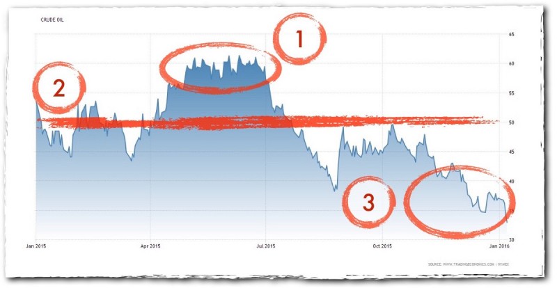 Динамика цен на нефть в 2015 году (долларов США за баррель). Все в соответствии с прогнозом.