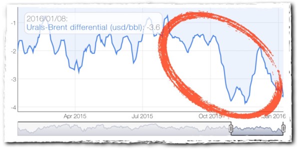 Сейчас дисконт к цене Brent у нашей цены Urals вырос в абсолютных значениях в январе 2016 года до 3,6 доллара за баррель, в относительных же величинах он больше 10%. А сейчас дополнительное снижение цены на 10% на фоне и так крайне непростой ситуации на рынке — это, конечно, дополнительный удар большой сковородкой с размаху. Хотя после падения бетонной плиты сверху на бедную российскую экономику в виде рухнувших общих мировых цен на нефть удар сковородкой, даже большой, уже большого значения не имеет :)