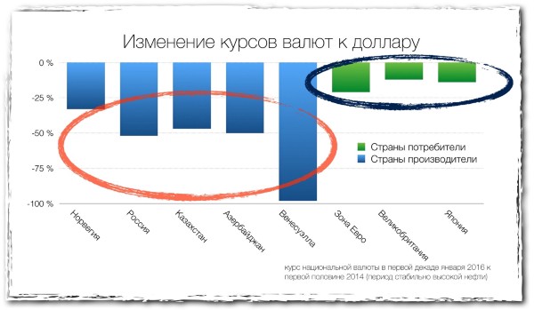 Экономика всегда имеет серьезные самобалансирующие механизмы. Поэтому на любую плохую новость всегда есть хорошая. Но опять же суровые законы экономики таковы, что хорошая новость для одних — это плохая новость для других. Девальвация локальных валют в нефтедобывающих странах позволяет частично компенсировать падающие доходы от экспорта.