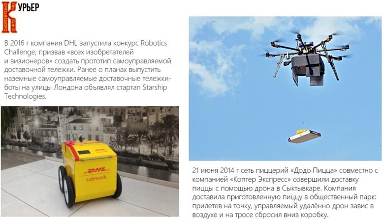 Технология дронов находит все более широкое применение во многом в силу роста емкости аккумуляторов. Во многих московских гипермаркетах уже сегодня можно приобрести за 6—7 тыс. рублей вполне функциональный дрон с камерой. И если не большую пиццу, то несколько пирожков он точно может поднять.