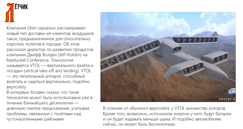 Компания Uber анонсировала серьезную программу по созданию аэротакси VTOL. Это аппарат вертикального взлета, по сути, грузоподъемный дрон. Любопытно то, что машина является полностью беспилотной, и не совсем понятно, что будет с летчиками, которые занимаются пассажирскими перевозками на малые расстояния.