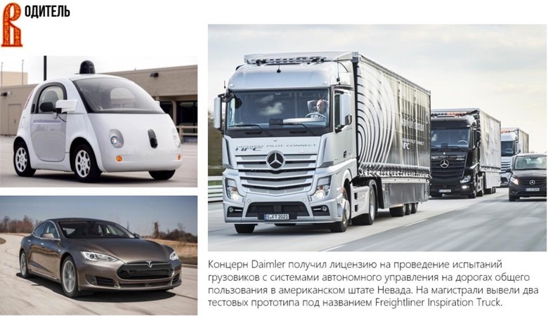 Эти истории все знают очень хорошо. Слева вверху GoogleCar, слева внизу TeslaModel S, которая оснащена функцией автопилота. Справа чуть менее известная история: концерн Daimler получил лицензию на испытание автоматизированных грузовиков, которые торжественно проехали довольно длинный маршрут по дорогам штата Невада.