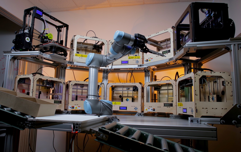 Пока нам требуются ещё люди на заводах, будут требоваться и роботы, которые способны рядом с этими людьми безопасно работать, так называемые коллаборативные роботы. Известнейший на сегодня пример подобного робота — Baxter, которого создали в компании RethinkRobotics. Ещев новой компании Tend.ai разработали роборуку, к которой прикрепляется обычная веб-камера. Считается, что такая роборука сможет облегчить работу с множеством 3D-принтеров. Она будет помогать обслуживать станки, помещая материал в 3D-принтеры и извлекая готовые изделияиз них. Tend.ai — это не единственный стартап, который по сути призван «заткнуть» прорехи в автоматизации производственных процессов, которые возникающие на месте стыка нескольких разнородных технологических решений. Запрограммировав роборуку выполнять те или иные несложные операции, можно будет избавиться от части сотрудников, которые подают материалы, заняты перемещением в производственном пространствепромежуточных результатов работы, рутинно обслуживают производственные механизмы.