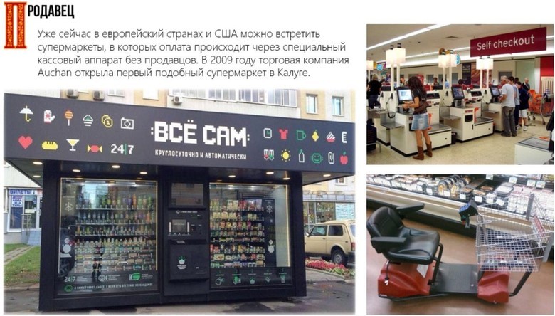 Все уже, наверное, сталкивались с автоматическими продавцами. Помимо вендинговых автоматов, которые установлены практически везде, множество полностью автоматизированных супермаркетов запущено в работу. Подобные магазины уже давно не диковинка в Европе, где их уже очень много.Первые подобные торговые предприятия открываются и в России. К примеру,ещё в 2009 году «Ашан» в Калуге открыл первый автоматизированный супермаркет.