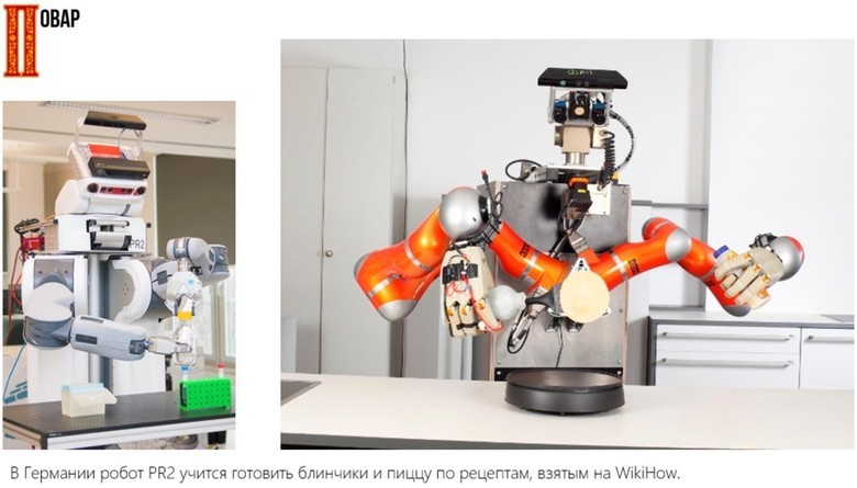 На сегодняшний день в мире существует довольно много забавных проектов по автоматизации работы повара. На картинке ниже показана антропоморфная машина, но чаще такие проекты ограничиваются набором роборук, как, скажем, в проекте «Автоматическая Кухня» (AutomatedKitchen) от MoleyRobotics. Используя систему рельсовых направляющих для перемещения различных элементов аппаратного комплекса автоматической кухни можно заодно заменить и официантов, как это сделано в ресторане Baggers (Нюрнберг, Германия). В ближайшие 10—20 лет роботы, по всей видимости, роботы смогут заменить людей при выполнении практически любых рутинных операций на кухне, полностью вытеснив из этой сферы людей.