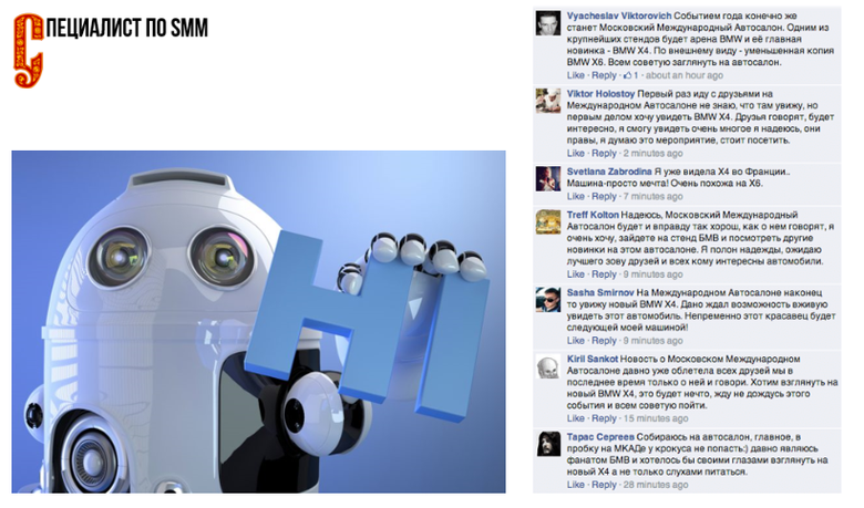 Я всегда думал, что в этой сфере с самого начала было очень много роботов. Когда читаешь примеры таких рекламных кампаний, то понимаешь, что если это и люди, то они уже низведены до уровня несложных механизмов. Не знаю, как вам, а мне как активному пользователю социальных сетей каждый день приходит две-три заявки от каких-то аккаунтов, у которых либо нет со мной общих друзей, либо два-три общих друга. И я их каждый месяц мониторю и разгребаю, захожу на страницы, смотрю, что там написано, что там в комментах. Пытаюсь понять, это живой человек меня зафрендил или просто штука, которая потом пригласит меня в очередную группу, добавит в какой-то нелепый чат, будет слать приглашения и так далее.