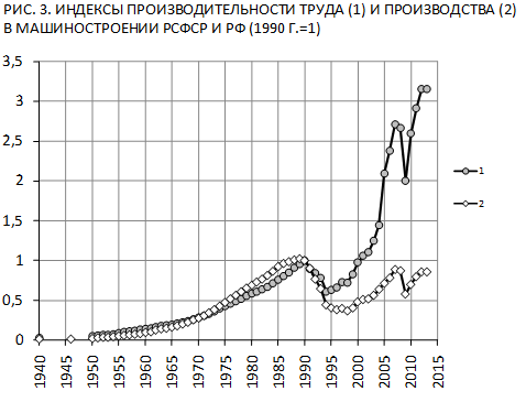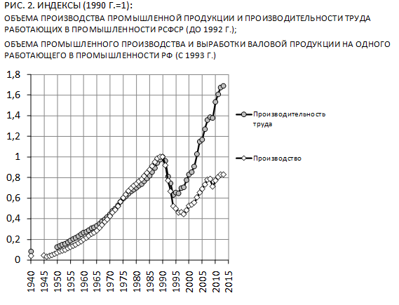 За годы реформ (1991–2013 гг.) промышленное производство после двукратного падения восстановлено на 83%, а численность промышленно-производственного персонала и промышленных рабочих только сокращалась: рабочих стало втрое меньше, а работников — вдвое. То есть, производительность труда в промышленности должна была вырасти. Так оно и было с середины 2000-х гг., хотя начиналось с обвального падения в начале 1990-х гг. (рис. 2).