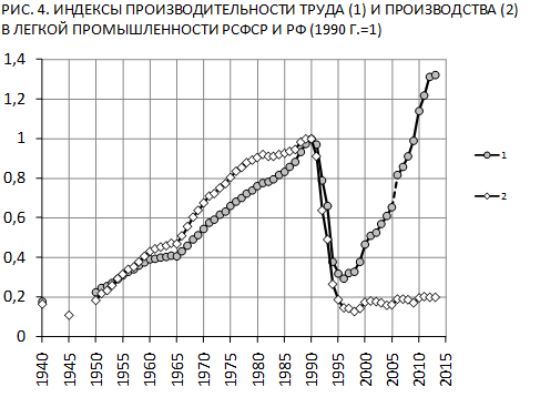 Как же так получается: во время реформы производительность труда выросла при общем регрессе промышленного производства (по большинству ключевых показателей: инвестиции, расход энергии, выпуск продукции, подготовка кадров, освоение производства высокотехнологичных видов продукции)? И почему этот важный критерий оценки реформ нигде не фигурирует в качестве достижения последних лет? Напротив, реформаторы сетуют, что производительность труда низкая и растет медленнее, чем зарплата. По официально опубликованным данным, чтобы в начале 2010-х гг. зарплаты росли быстрее производительности, надо было поднять их в промышленности примерно на треть — реально производительность обгоняла зарплату.