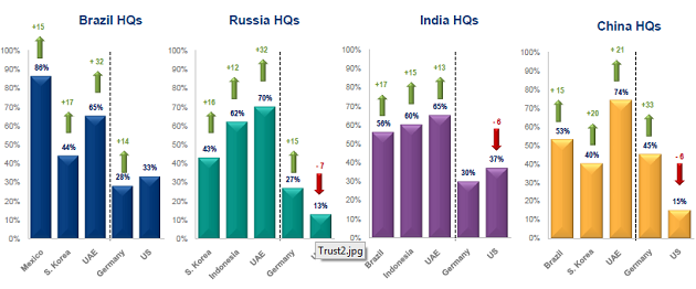 На привлечение туристов нацелены ролики, представляющие страну в наилучшем свете (этим занимаются отели, специализированные организации, ассоциации турагентств). На привлечение же инвестиций сильно влияет имидж страны там, откуда привлекаются деньги. На диаграмме (см. рис. 2) видно, что бразильские компании пользуются доверием в Мексике и ОАЭ, индийские – в Индонезии, российские – в Германии (но они не особо привлекательны для американцев).