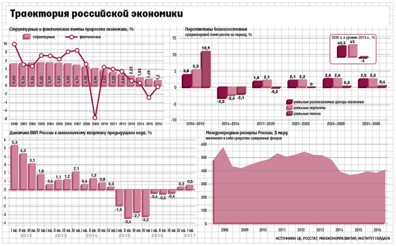 За 2010–2016 годы экономика России в среднем росла на 1% за год против 3,8% среднегодового роста мировой экономики за этот период, увеличивая разрыв с развитыми странами, среднегодовой темп которых составлял 1,9%. С учетом 2008–2009 гг. среднегодовой рост России к настоящему времени – 0,9% против 3,3% мировой экономики и 1,1% группы развитых стран.Фактически Россия уже десять лет находится в стагнации (хотя в данный промежуток времени входят и 2 рецессии, и периоды быстрого восстановления после предпоследней из них).