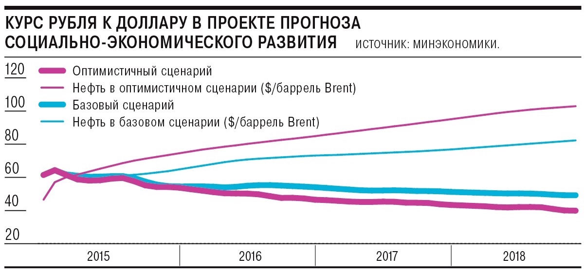 Обновленный прогноз Минэкономики предполагает во всех сценариях укрепление рубля с августа—сентября 2015 года почти вне зависимости от цен на нефть: в случае постепенной отмены санкций до 40 руб./$, в пессимистической версии до 50 руб./$, но лишь к концу 2018 года. Это лето в прогнозах ведомства Алексея Улюкаева для валютного курса выглядит сложным: предполагается, что при стабильных ценах на нефть летом 2015 года рубль будет умеренно снижаться.