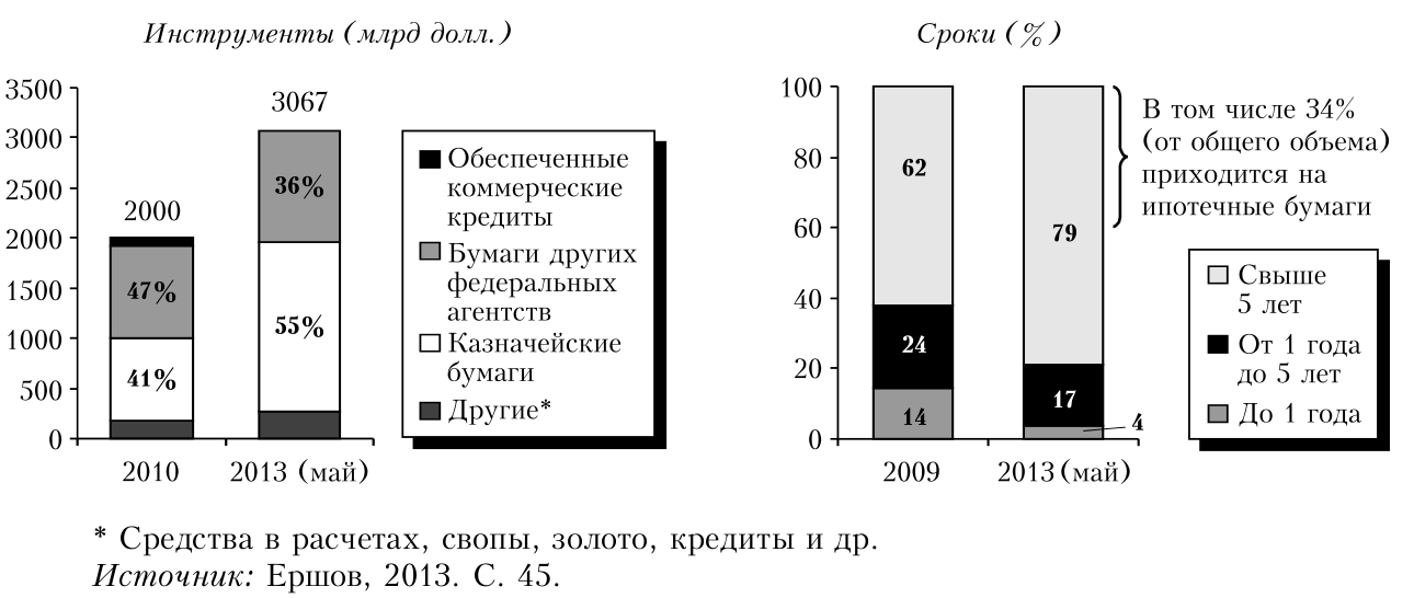 Хотя формально главным инструментом регулирования предложения денег является ключевая ставка Банка России, последний признает, что продолжает руководствоваться количественными ограничениями при определении объемов денежной эмиссии, произвольно устанавливая «максимальный объем денежных средств, предоставляемых на аукционах» (по предоставлению кредитных ресурсов на неделю по операциям РЕПО, составляющим основную часть потока эмитируемых Банком России денег) (Банк России, 2013). Эти деньги предназначены для текущего балансирования спроса и предложения ликвидности банковского сектора и не могут использоваться в качестве источника кредитования производственной сферы. Основная часть притока кредитных ресурсов на эти цели вплоть до последнего времени поступала из-за рубежа, обременяя российскую финансовую систему растущими обязательствами.