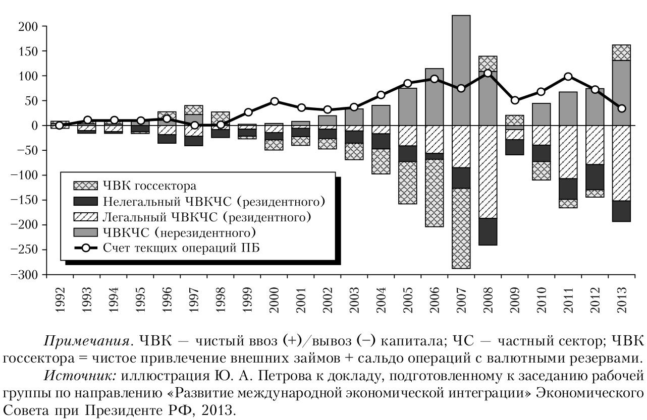 Опыт кризиса 2008 г. выявил высокую уязвимость российской экономики от мирового финансового рынка, регулирование которого осуществляется дискриминационными для России способами, включая занижение кредитных рейтингов, предъявление неравномерных требований по открытости внутреннего рынка и соблюдению финансовых ограничений, навязывание механизмов неэквивалентного внешнеэкономического обмена. Вследствие этого Россия ежегодно теряет около 100 млрд долл., в том числе около 60 млрд долл. уходит из страны в форме сальдо по доходам от иностранных кредитов и инвестиций и около 50 млрд долл. составляет нелегальная утечка капитала. Накопленный объем последней достиг 0,5 трлн долл., что в сумме с прямыми иностранными инвестициями российских резидентов составляет около 1 трлн долл. вывезенного капитала. Потери доходов бюджетной системы из-за утечки капитала составили в 2012 г. 839 млрд руб. (1,3% ВВП). Общий объем потерь бюджетной системы вследствие офшоризации экономики, утечки капитала и других операций по уклонению от налогов в 2012 г. составил 5 трлн руб. (Петров, 2013). На этом фоне серьезные преимущества получает иностранный капитал.