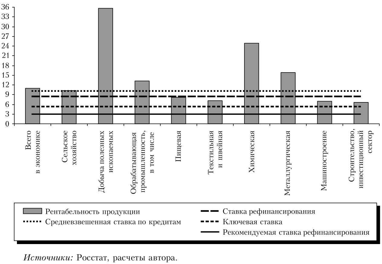 Рис. 1. Доходность операций в производственной сфере и ставка ЦБ РФ, 2012 г. (в %)