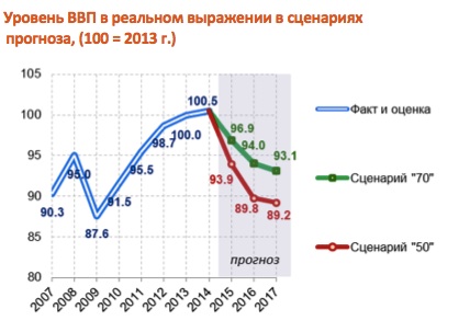 Согласно первому сценарию ЦР, цены на нефть марки Urals (именно ее производит Россия) составят в среднем $70 за барр с 2015 по 2017 годы. Фактически этот сценарий предусматривает повышение цен с нынешних уровней, что должно смягчить падение экономики.