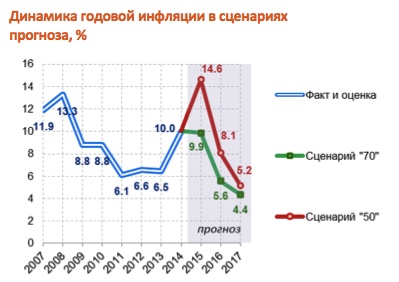 В такой ситуации в 2015 году цены вырастут на 15%. Центробанку будет тяжело справиться с такой высокой инфляцией. В последующие годы цены также будут расти довольно сильно: в 2016 году инфляция снизится до 8-9%, а в 2017 году – до 5%.