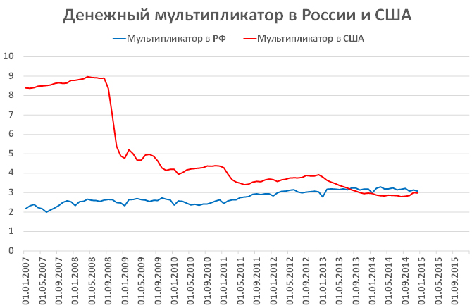 Актуальность количественного смягчения в России подтверждается и тем, что денежный мультипликатор (отражающий так называемый левередж финансовой системы, соотношение денежной массы к денежной базе) в России с августа 2013 года стал больше, чем мультипликатор в США. Казалось бы, финансовую систему России можно поздравить – она стала «круче» американской, хотя всегда отставала по этому показателю. Ура, догнали и перегнали Америку! На самом деле, впору приносить соболезнования. Ведь российской финансовой системе (банкам в первую очередь) из-за этого приходится работать в значительно более напряженных и жестких условиях, чем финансовой системе США, и это в условиях кризиса.