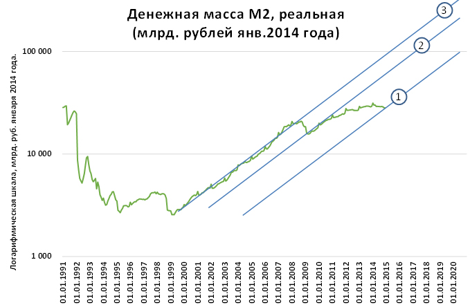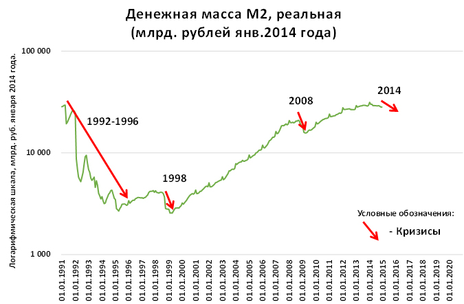 Чтобы понять долгосрочные цели денежно-кредитной политики, необходимо взглянуть на график, где денежная масса откладывается по логарифмической шкале. Так, на графике 8 видно, что все периоды кризисов в истории современной России (с 1992 года) легко объясняются падением денежной массы.