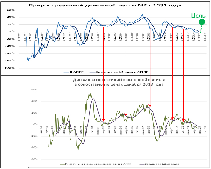 • В 2014 году падение денежной массы уже чётко обозначилось. Оно не такое резкое, как в предыдущие кризисы. Но результат неизбежно тот же – если срочно не вмешаться в ситуацию, падение ВВП гарантировано. Вмешаться еще не поздно, и рост ВВП в 2015 году более чем реален, если реализовать описанные выше краткосрочные меры.