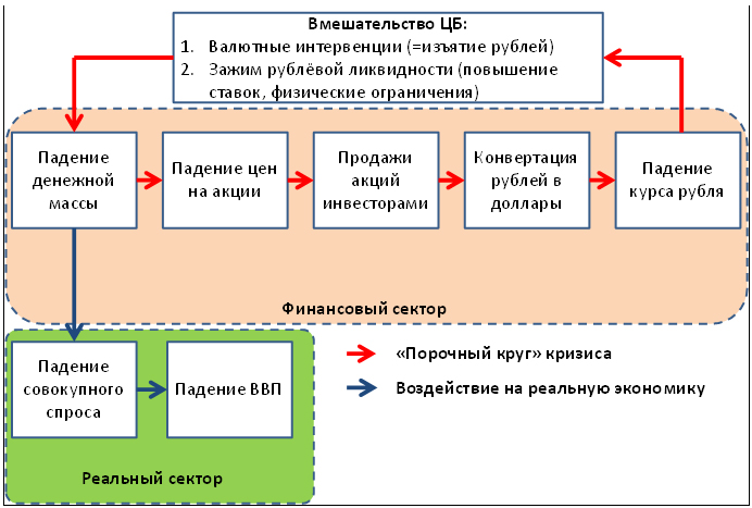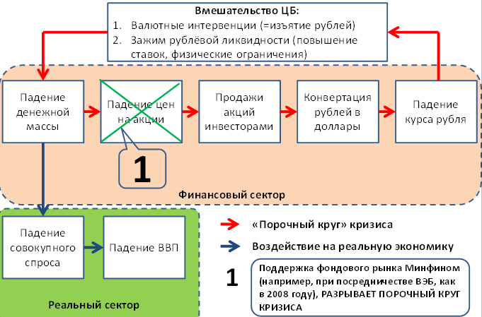 На этом этапе зарождающийся кризис было купировать легко: необходимо было вернуть темпы роста денежной массы к привычным для экономики значениям. Это мог сделать Минфин, отказавшись от политики концентрации рублевой массы на счетах Казначейства в ЦБ. Это мог сделать ЦБ, компенсировав действия Минфина собственными силами. Но всё произошло «с точностью до наоборот»: дальше действовало сразу три «порочных круга» (по научному: «положительная обратная связь»).