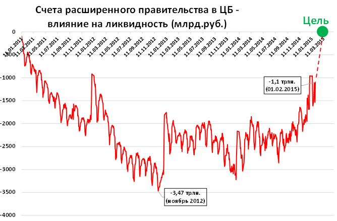 Задача, которую сейчас необходимо решить Минфину, имеет чёткое цифровое измерение. В течение февраля-марта 2015 года необходимо полностью ликвидировать негативное влияние т.н. расширенного правительства на ликвидность в банковском секторе, накопившееся с января 2011 года.
