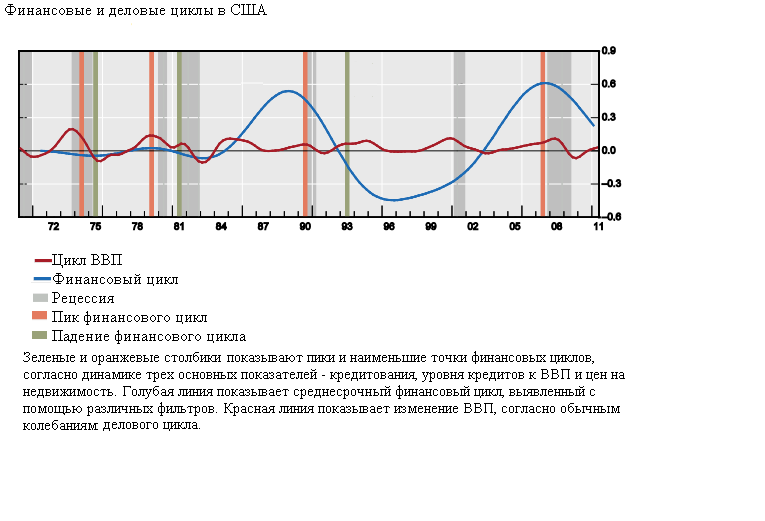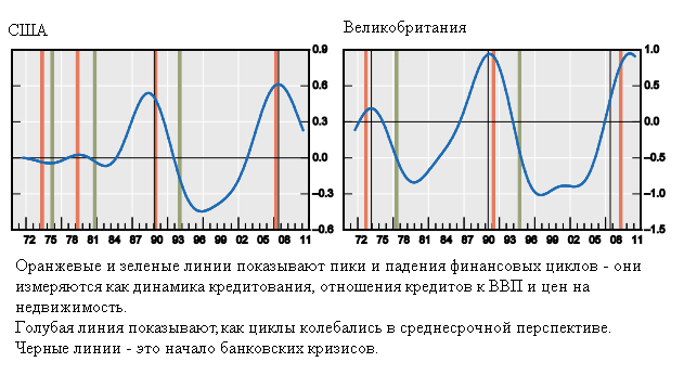 - Сразу вслед за пиком финансового цикла следует кризис. Обычно, как только цикл доходит до своей верхней точки, начинается банковский кризис. За все время изучения 7 развитых экономик, кризис не следовал сразу за пиком только в том случае, если он был вызван внешними потерями банков и финансовых институтов. Например, недавние проблемы в банковских системах Швейцарии и Германии были связаны с финансовыми циклами других стран Европы и США.