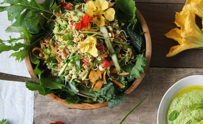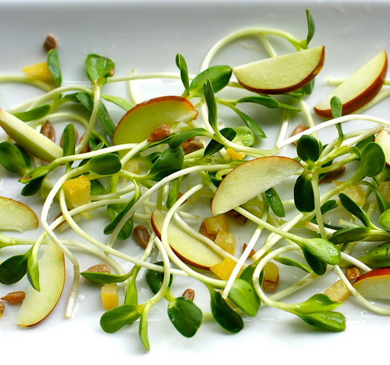 Пример биогенной еды: проросшие семена и ростки подсолнечника, тыквы, льна, кунжута; проращенные зёрна пшеницы, ржи, ячменя, амаранта; горчицы, нута, маша.