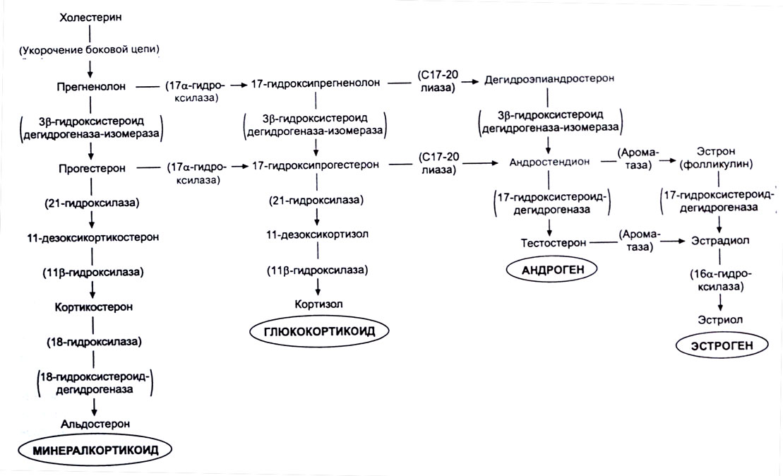 Как вы видите на рисунке ниже, все стероидные гормоны (включая кортизол) синтезируются из холестерола. Первым делом холестерол превращается в прегненолон, который затем может перейти либо в прогестерон, либо в ДЭА, «мать гормонов» тестостерона и эстрогена. Когда стресс хронический или избыточный, производится больше кортизола за счет ДЭА, тестостерона и эстрогена. Нормальный процесс старения связан с небольшим сдвигом к большему производству кортизола и одновременным снижением образования других гормонов.