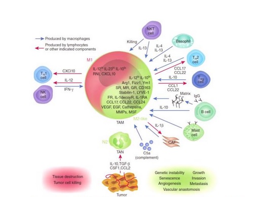 Если в опухоли присутствует большое число М1-макрофагов, то от этого она плохо растет, в результате может наступить полная ремиссия. М2-макрофаги, наоборот, выделяют факторы роста, которые способствуют делению раковых клеток. Эксперименты показали, что вокруг опухоли всегда находится многоМ2-клеток. Под воздействием М2-макрофагов М1-макрофаги перепрограммируются и превращаются в первых. «Убийцы» больше не могут наносить повреждения, синтезировать антиопухолевые цитокины, а начинают выделять вещества, способствующие росту опухоли.