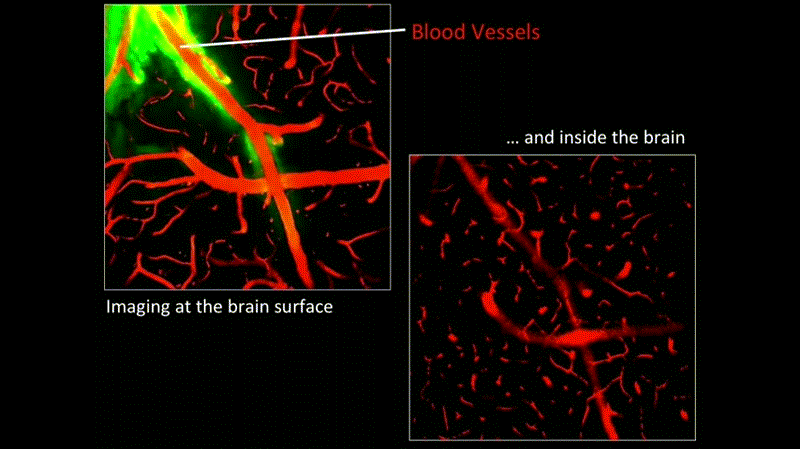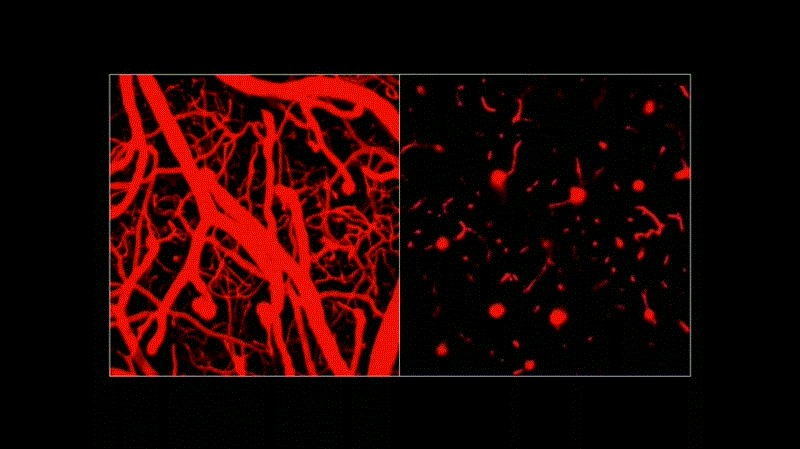 Это кровеносные сосуды мозга мыши, они формируют сложную сеть. Она охватывает весь мозг полностью, спускаясь с поверхности в глубину, и доставляют питательные вещества в каждую клетку мозга.