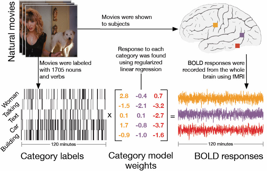 Затем при помощи метода линейно-регрессионного анализа ученым удалось обнаружить взаимосвязь данных, способствовавших построению модели, отразившей то, как каждый из почти 30 000 участков коры головного мозга отреагировал на 1700 категорий объектов и действий, показанных в кинофрагментах. Затем был использован принципиальный компонентный анализ, сущность которого сводится к выделению признаков или «семантического пространства», объединяющего исследуемые единицы в группы.